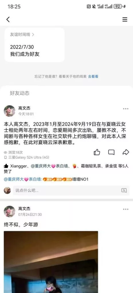 重庆师范大学的高文杰被指责为渣男,明明已有女友,却频频背叛感情,甚至谎称自己单身,试图与前女友复合。在最终被女友揭穿后,证据确凿,他的伪装不再成立,女友愤怒地在街头揭露他的真实面目,场面如同林黛玉倒拔垂杨柳,令人震惊。
