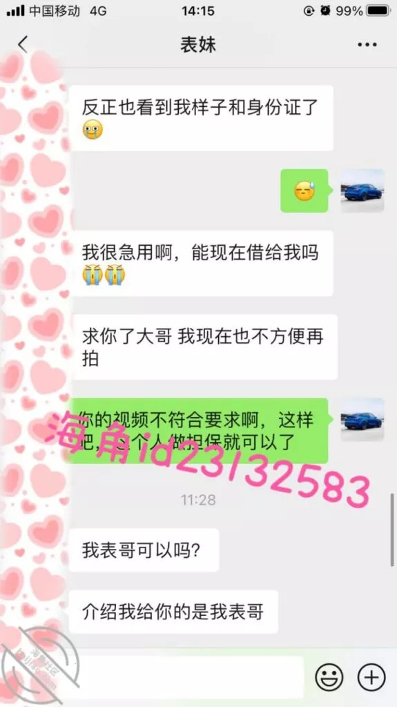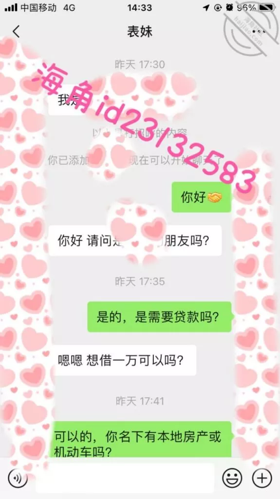微信小号加了表妹之后她说想借1万,我问她有没有房子车子和工作社保,这属于明知故问让她跟着我的节奏走,然后引导她拍果贷视频给我,之后她就没有回复我了,希望她找不到其他人借钱吧