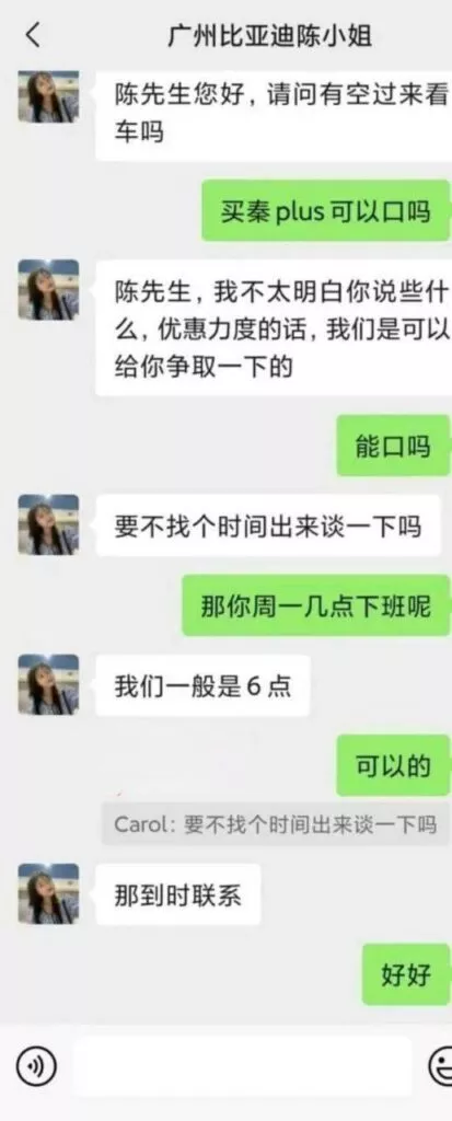 广州比亚迪4S店近日被曝出不当事件。店内一位名为陈小姐的销售人员被指控为顺利促成销售而不惜以身体相待。她甚至表示,只要客户表现出明显的购买意图,愿意陪客户共度一晚。这样的行为真令人震惊。