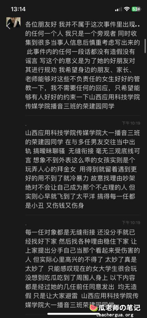 山西应用科技大学传媒学院大一新生荣建园,长期劈腿出轨,对外人设完美无瑕,实则喜欢玩弄感情,同时交往多人,只为满足自己的拜金和欲望。