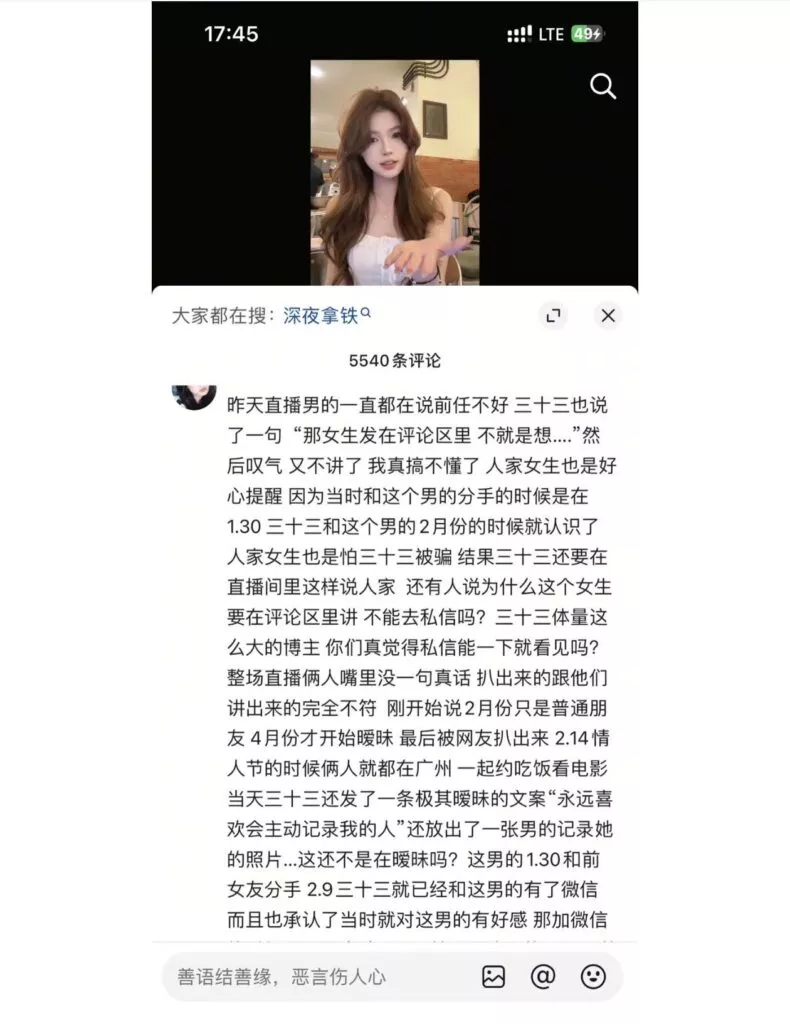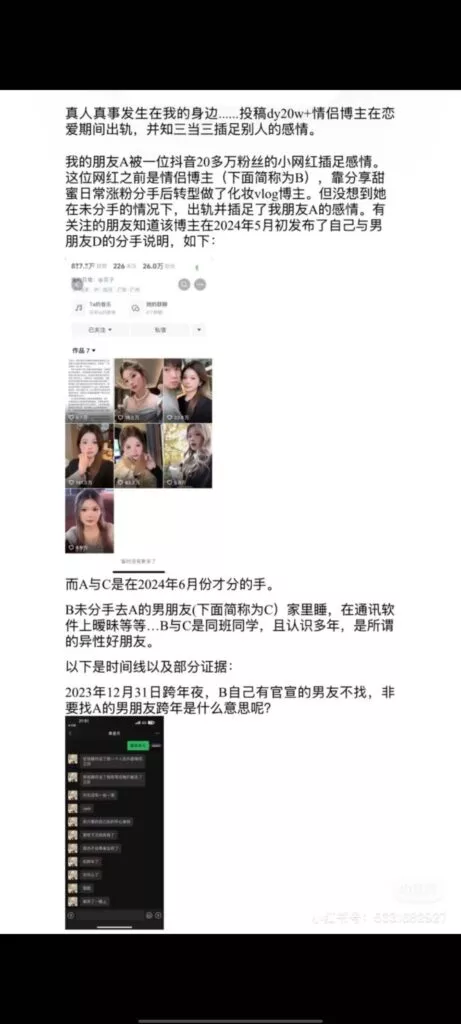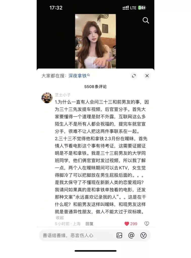 先提车后分手,抖音40万粉丝清纯网红三十三,打着一手清纯好女孩的人设,实际非常拜金,周旋于数个男人之间,卖弄清纯人设,利用完后果断丢弃,甚至伪造事实,引导粉丝网暴前男友。