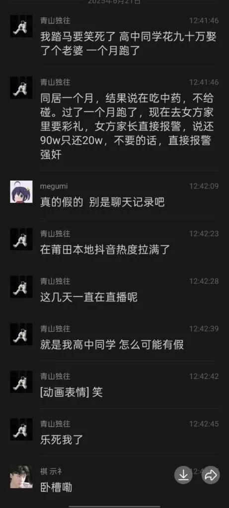 比大同订婚QJ案更离谱的事发生了,这次还是新婚不到一月的准夫妻。福建莆田一男子花费高达90万彩礼娶了老婆回家,结果不到一月,妻子就跑回老家悔婚,岳父家更是放话彩礼只退20万,不同意就告男子QJ罪。