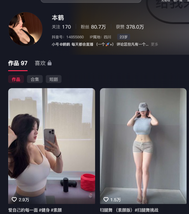 从闺蜜互撕引发的大尺度视频泄露,到如今借此机会涉足成人产业,这位网红无疑对流量的运作了然于心。她在抖音上拥有80万粉丝,以其顶级身材和擦边的内容吸引了大量关注。最近,本鹤的一对一果聊视频也在网络上流出。