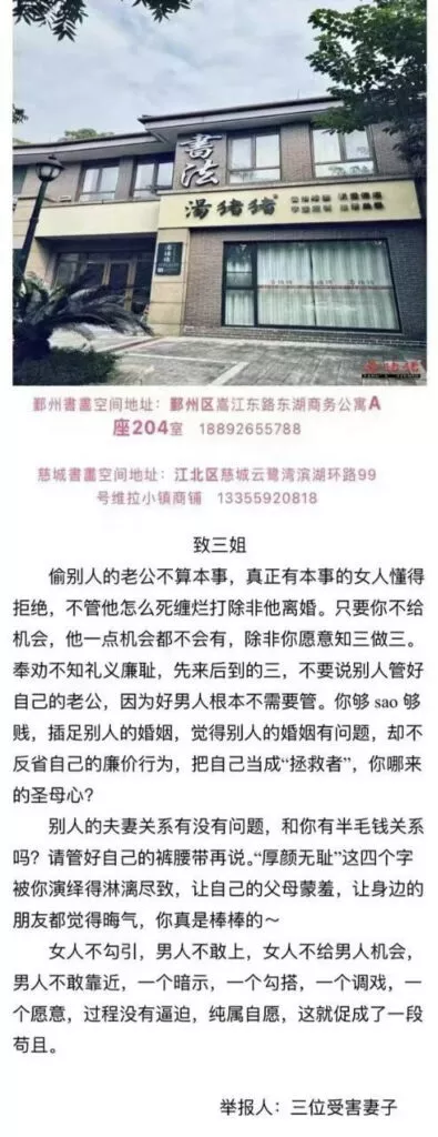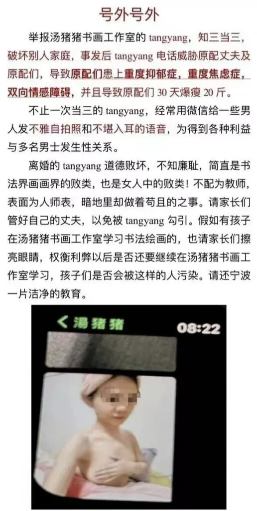 浙江宁波江北区汤猪猪书画工作室员工汤杨,在离婚后同时吸引了三位已婚男子,导致三个家庭破裂。她的不道德行为引起了三位原配妻子的愤怒,她们联名进行了举报,并公开了汤杨的露脸视频。