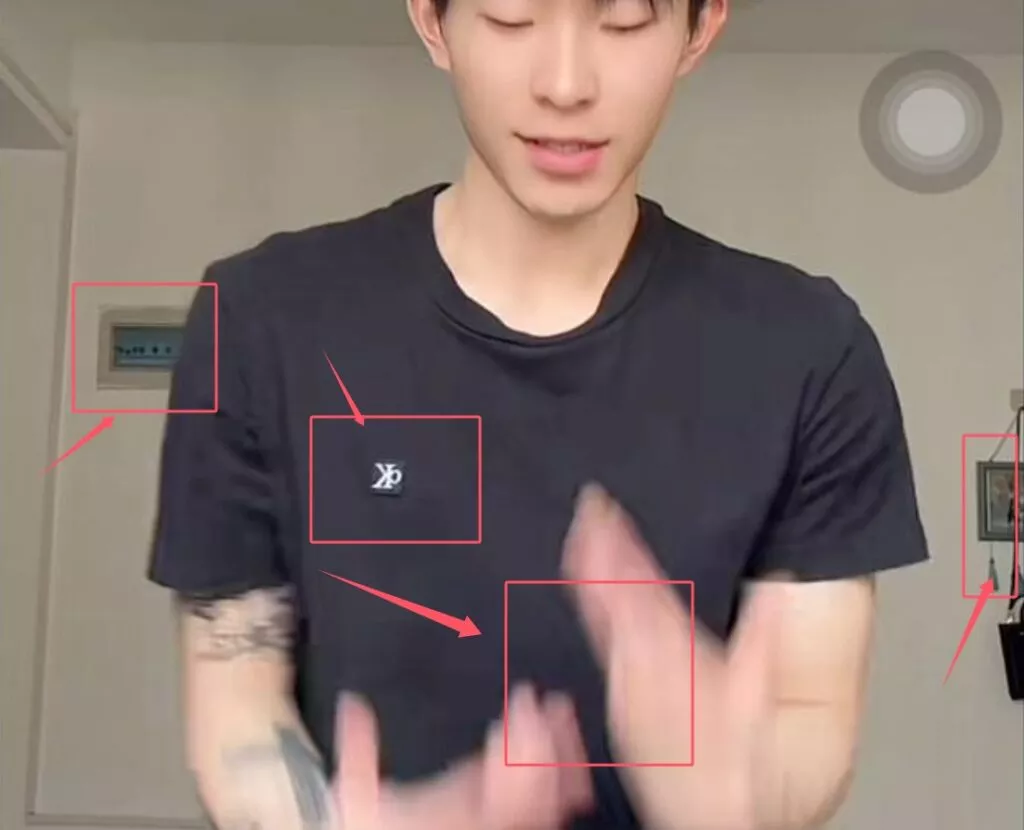 对比手型动作和背景以及上衣上的logo即可看出端倪