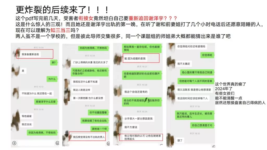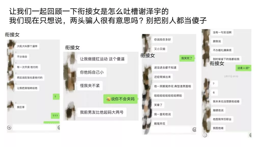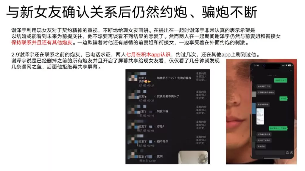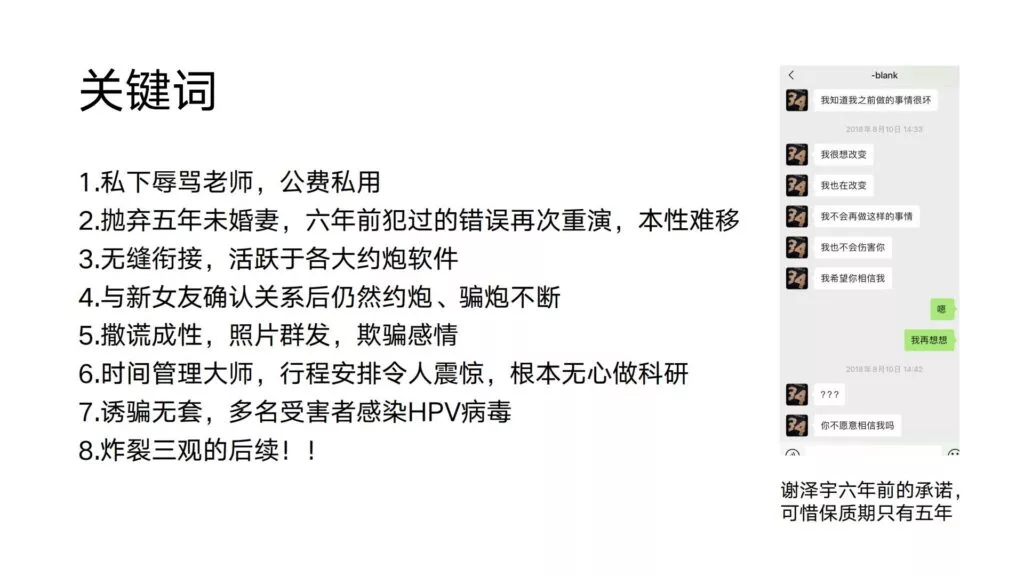 24页的PPT曝光了华东理工大学毒王谢泽宇,此人是上海211名校的学生。他的未婚妻,交往了五年,揭露了他的不堪行径:他长期与多名女性保持暧昧关系,身患性病却毫无自爱之心,利用PUA手段Cao控多位女性,从而导致她们也受到感染。同时,他还利用研究经费来贿赂他人,为自己的私利谋取便利,甚至公开辱骂自己的导师。